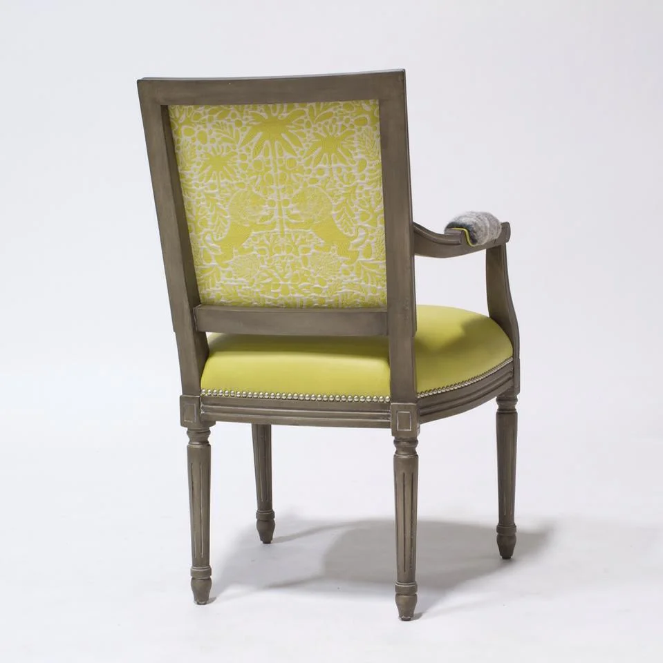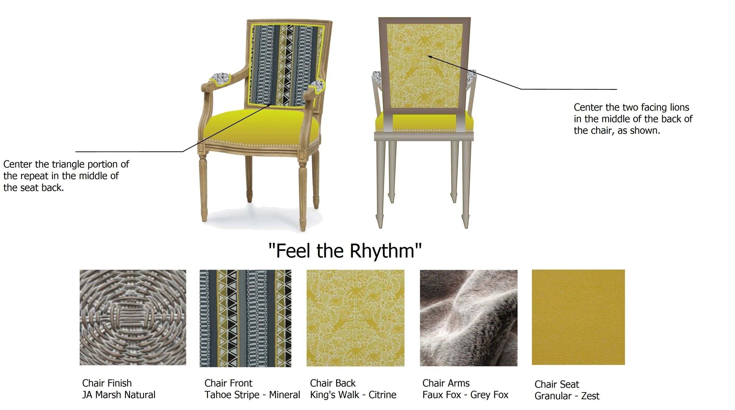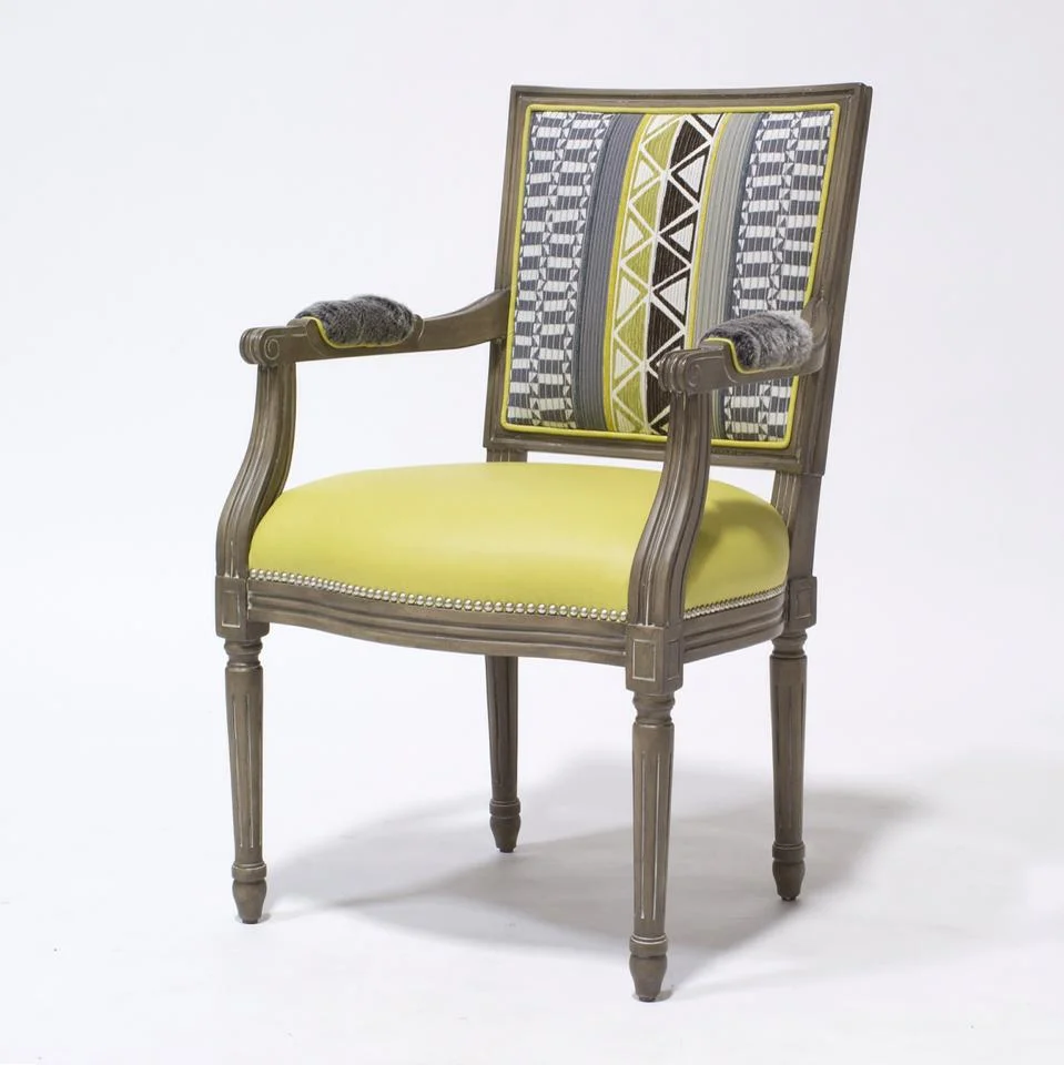 We wanted our chair to evoke a spirit of life and survival. Every day is a challenge for those who face this disease and every day requires new bravery and strength. Using vibrant citron greens and mineral neutrals to ground the palette, we felt a tribal styled chair conveys our message perfectly... And the faux fur on the arms is the cherry on top!